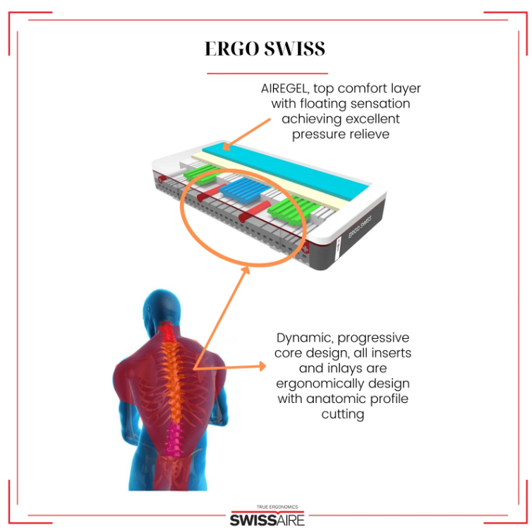 SwissAire Ergo-Swiss, The Epitome of the finest sleep ergonomic precision. A sensual luxury, offering a haven of sweet dreams and deep, restorative sleep.